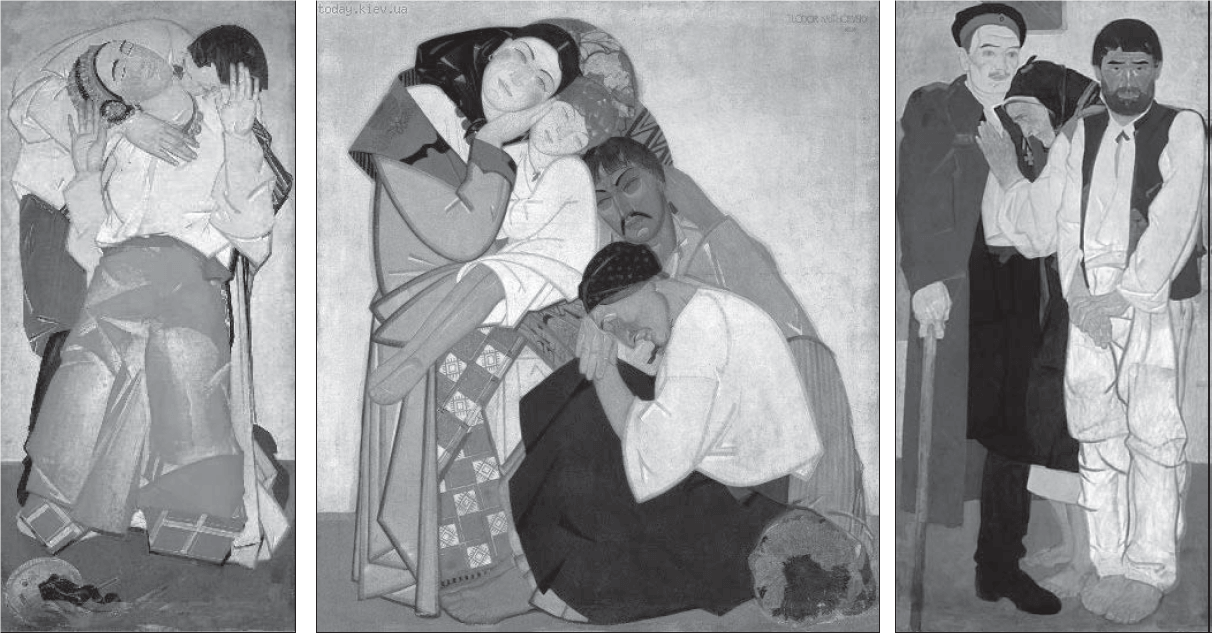 Розгляньте репродукцію триптиха Ф. Кричевського та виконайте завдання.  Автор художніми засобами відобразив трагізм подій | А | Першої світової війни (1914–1918 рр.). | | Б | масового голоду (1921–1923 рр.). | | В | акції «пацифікації» (1930 р.). | | Г | насильницької колективізації (1929–1937 рр.). |